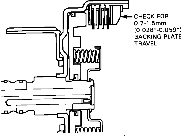 Apply an evenly distributed load in the direction indicated in Figure 3 to remove slack from the clutch assembly. Use 20 lbs. (9kg) of pressure against the backing plate--excessive pressure will cause an inaccurate measurement. With the clutch assembly compressed, use a feeler gauge to measure the distance between the backing plate and snap ring. Correct backing plate travel is 0.7 mm-1.5 mm (0.028"-O.059").