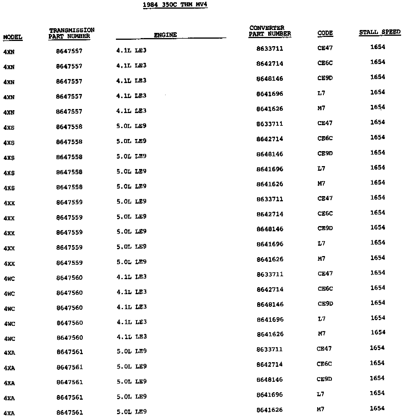 The information is provided for 1984 model transmissions. It will enable you to identify some models and converter usage.