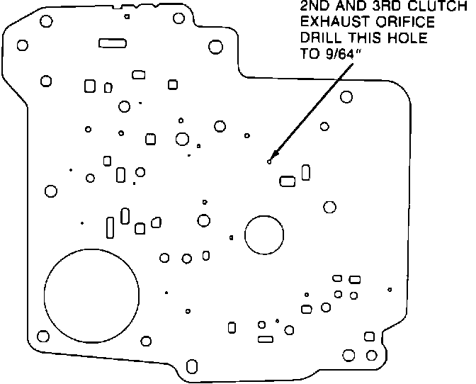 2. On 1984 and early 1985 THM 200C transmissions built prior to Julian date 268 remove the valve body spacer plate. Drill the 2nd and 3rd clutch exhaust orifice out to 3.57 mm (9/64"). Emery cloth both sides of the hole, slightly, to remove burrs and rough edges (Figure 2). Also remove the primary spring from the governor assembly (Figure 1) . The 1983 THM 200C transmissions have the larger (9/64") orifice hole and will require only the removal of the primary governor spring.
