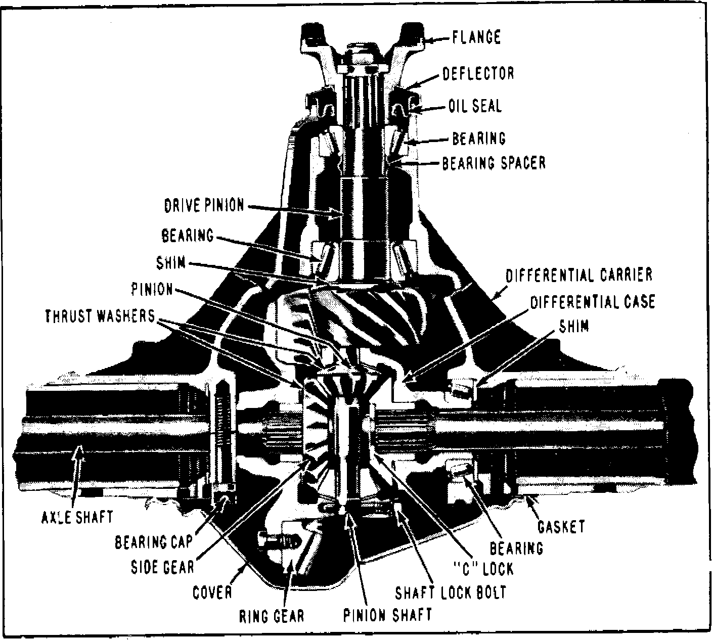 The differential is supported in the carrier by two tapered roller side bearings. These are preloaded by inserting shims between the bearings and the pedestals. The differential assembly is positioned for proper ring gear and pinion backlash by varying these shims. The ring gear is bolted to the case. The case houses two side gears in mesh with two pinions mounted on a pinion axle which is anchored in the case by a spring pin. The pinions and side gears are backed by thrust washers.