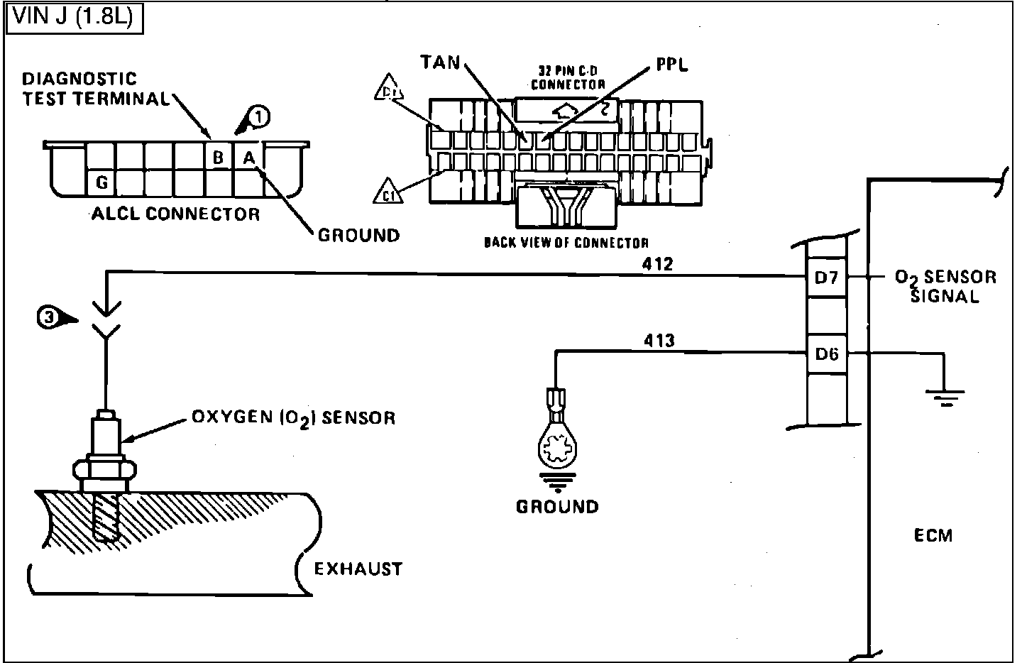 The ECM supplies a voltage of about .45 volt between terminals "07" and "08". (If measured with a 10 megohm digital voltmeter, this may read as low as .32 volts.) The O2sensor varies the voltage within a range of about 1 volt if the exhaust is rich, down through about .10 volt if exhaust is lean.