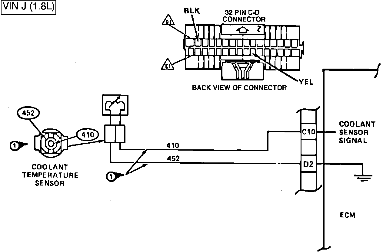 As the engine warms, the sensor resistance becomes less, and the voltage drops. At normal engine operating temperature, the voltage will measure about 1 to 1.5 volts at the ECM terminal C-10.