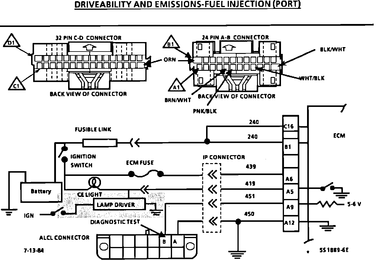 There should always be a steady "SERVICE ENGINE SOON" Light when the ignition is "on" and engine stopped. Battery ignition voltage is supplied to the light bulb. The Electronic Control Module (ECM) will turn the light on by grounding circuit 419 at the ECM. With the diagnostic terminal grounded, the light should flash a Code 12, followed by any trouble code(s) stored in memory. A steady light suggests a short to ground in the light control circuit 419, or an open in diagnostic circuit A51.