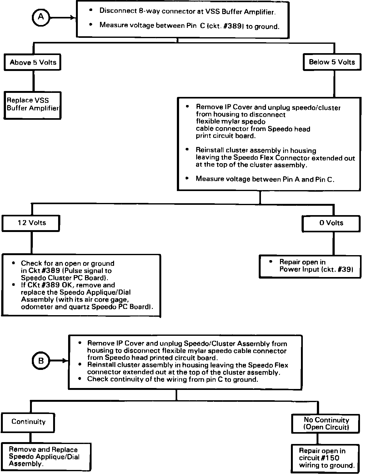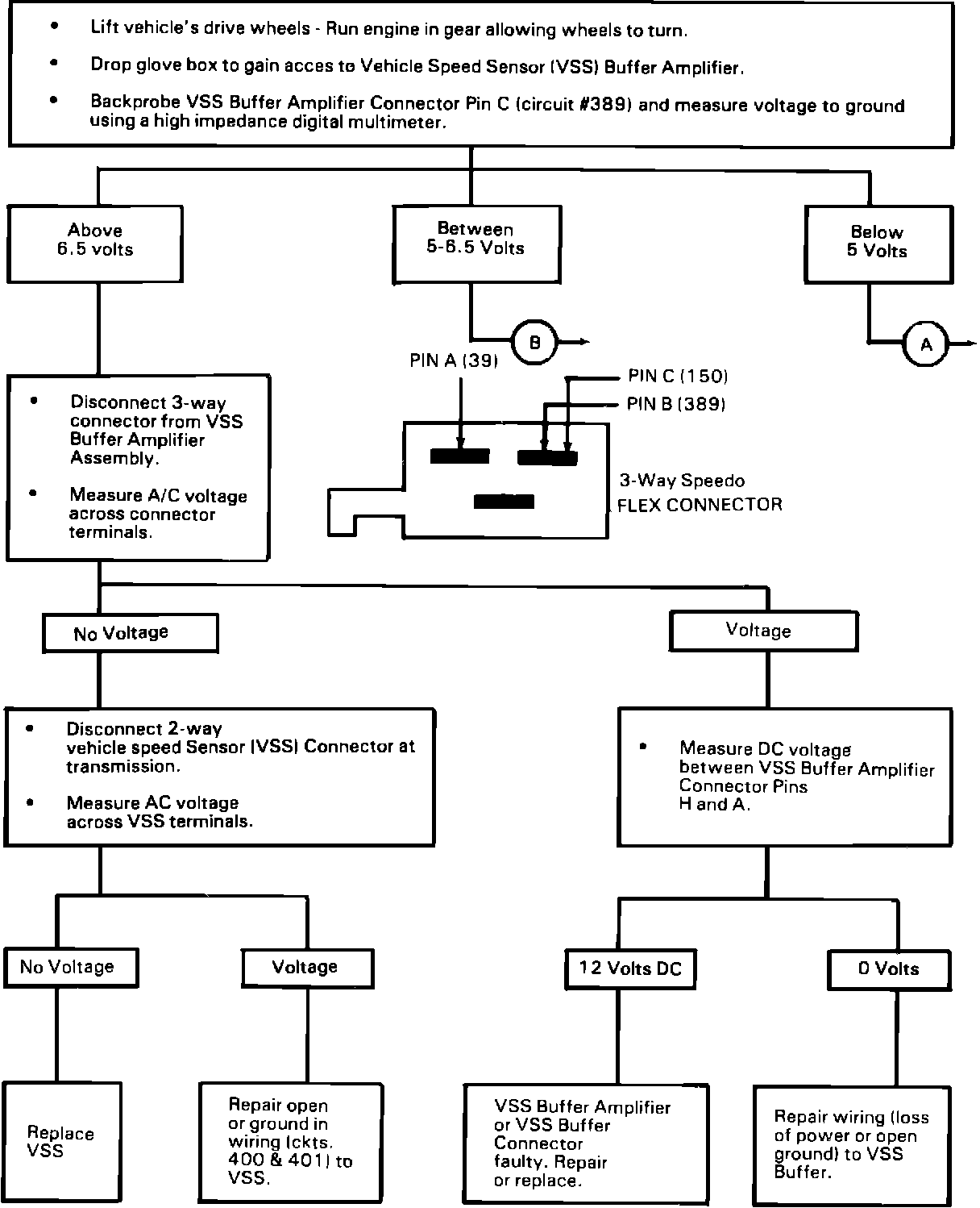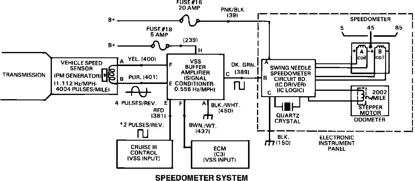 Figure 1 is a diagnostic chart for speedometer inoperative. Figure 2 is a schematic of the speedometer electrical system. Please note that if the cruise and/or TCC are also inoperative; the condition may be in the Vehicle Speed Sensor (VSS) Buffer Amplifier, the VSS (P.M Generator), wiring for the VSS Buffer Amplifier or VSS, or transmission. If only the speedometer is inoperative; the problem is in the VSS Buffer Amplifier, Speedometer, or wiring for the VSS Buffer Amplifier or Speedometer.