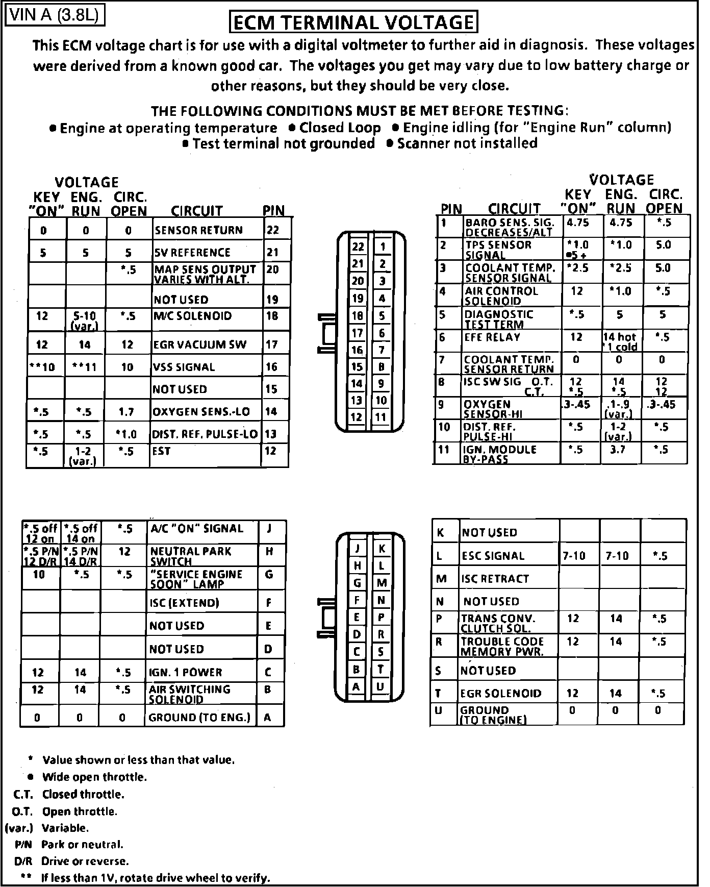 Fig. 014 - ECM Connector Terminal Identification & Voltage Specifications.:
