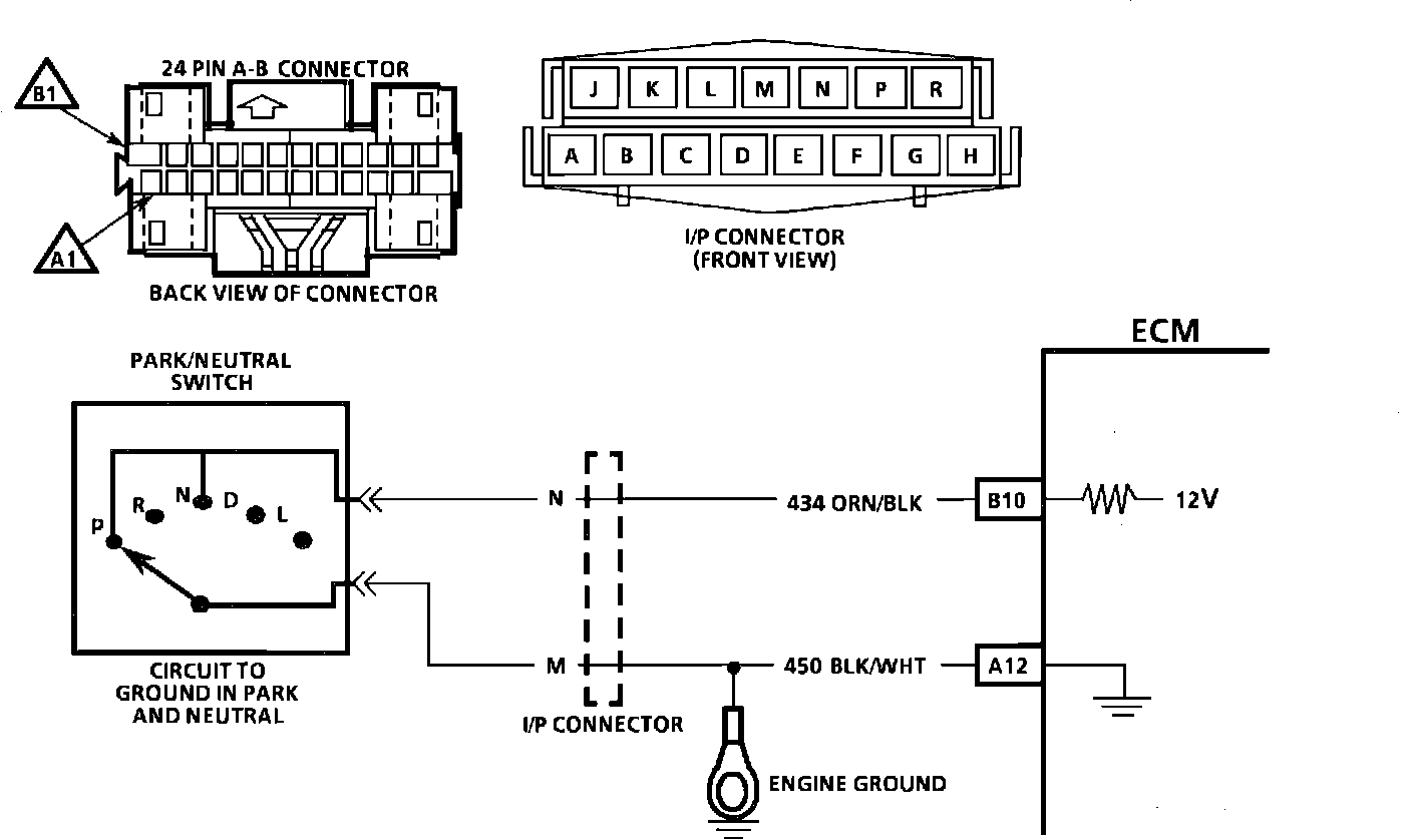 3. Checks to this point indicate the P/N switch and wiring are OK, however, the ECM signal voltage on CKT 434 may be missing. To check, reconnect ECM. Either back probe ECM connector CKT 434 with selector in drive or disconnect P/N switch and probe harness connector CKT 434 with a voltmeter to ground.