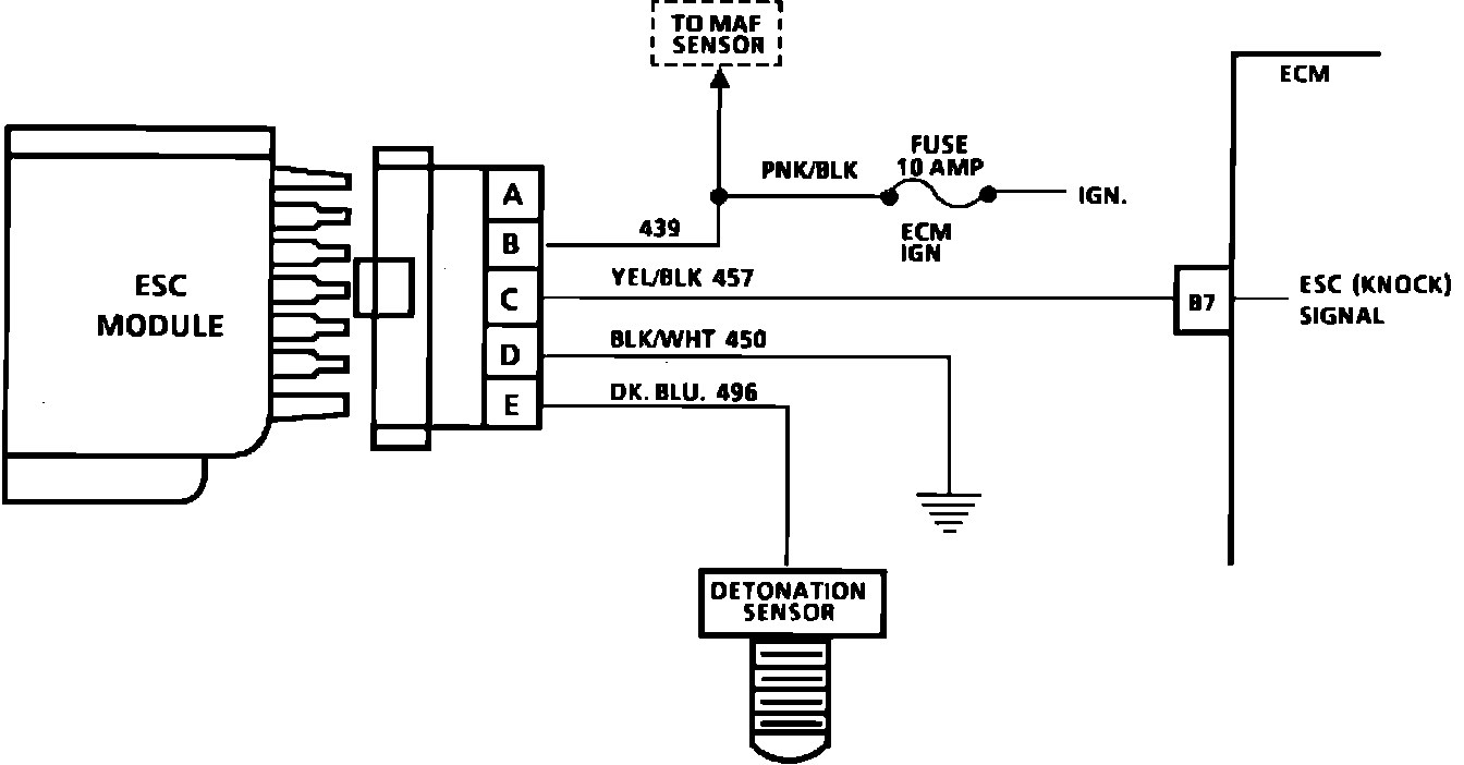A loss of the Detonation sensor signal or a loss of ground at ESC module would cause the signal at the ECM to remain high. This condition would result in the ECM controlling EST as if no detonation were occuring. The EST would not be retarded, and detonation could become severe enough under heavy engine load conditions to result in pre-ignition and potential engine damage.