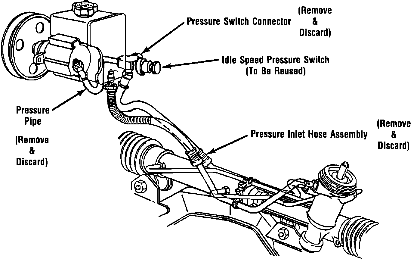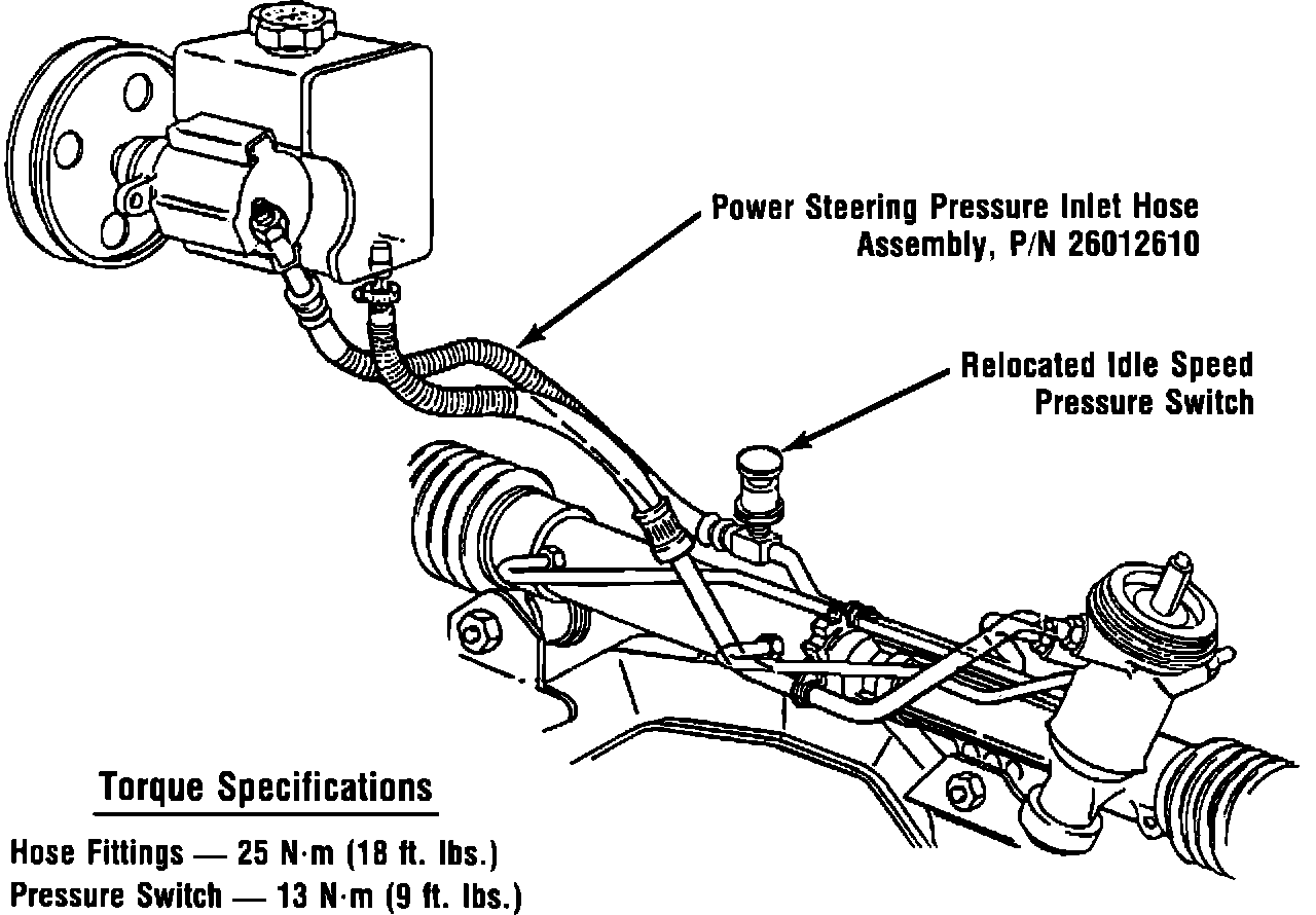 A new power steering pressure inlet hose assembly, Part Number 26012610, has been released for service usage. This new assembly will replace the existing pressure inlet hose assembly, idle speed switch connector and pressure pipe. (See Figure 1).