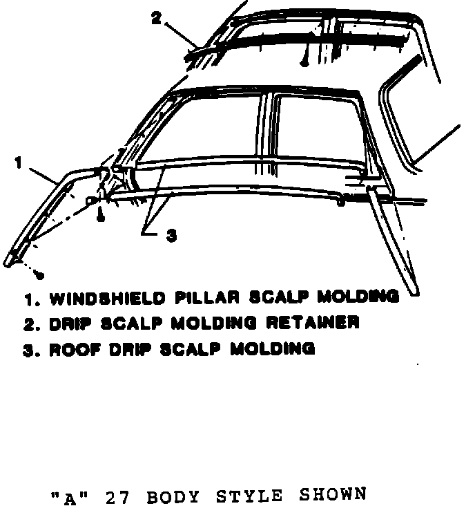 1. Remove screws from windshield pillar scalp molding (1) and slide downward and away from retainer (2) and drip scalp molding (3). See Illustration.