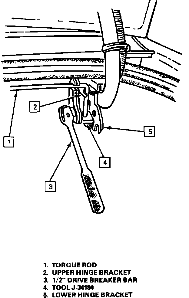 3. To decrease the amount of effort needed to raise the lid or increase the amount of effort needed to close the lid, reposition the end of the rod to the next notch towards the front of the car using tool J-34194 or equivalent, and a 1/2" drive breaker bar. With both hands on the ratchet handle, disconnect the torque rod from the bracket and then from the lower bracket. Reconnect torque rod to lower bracket and then to top bracket.