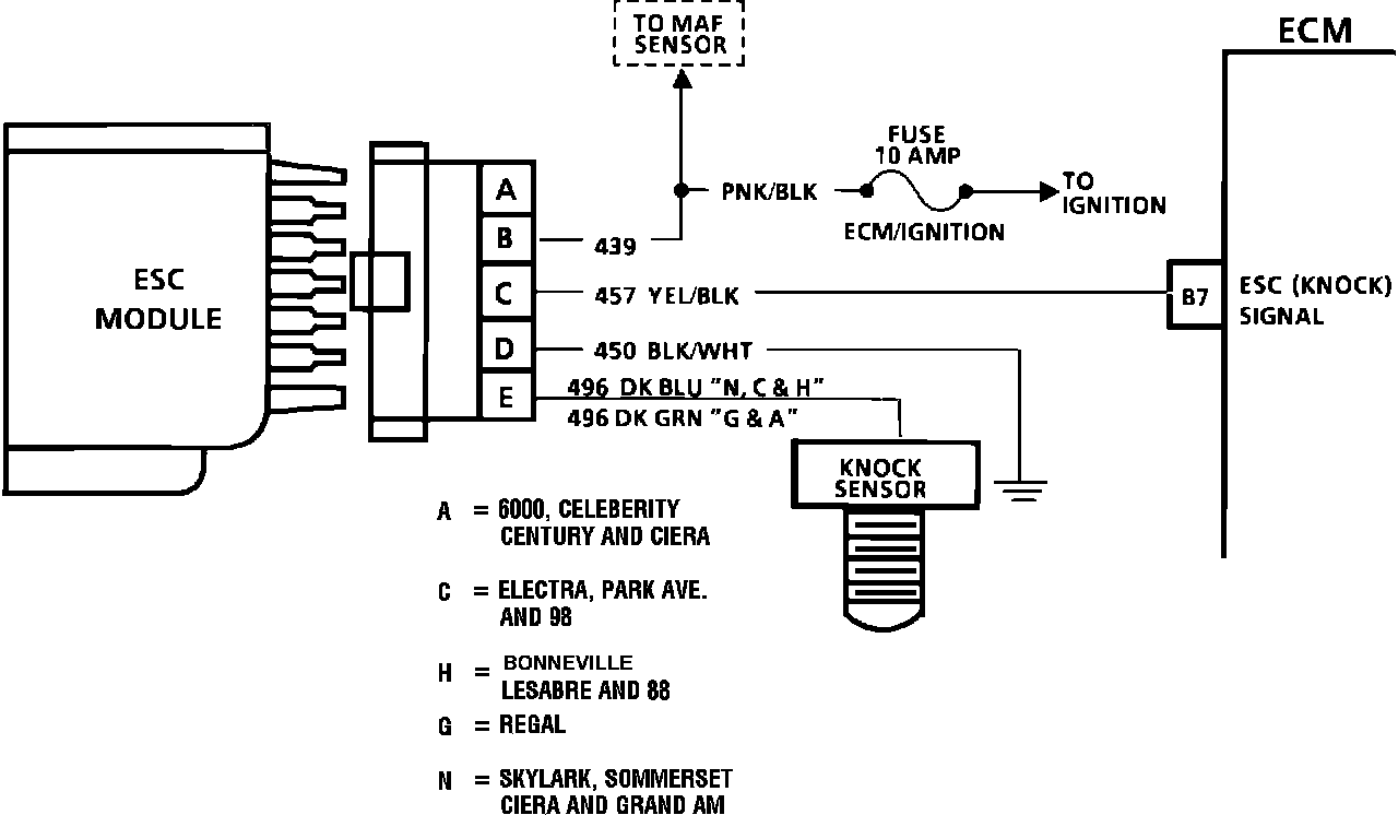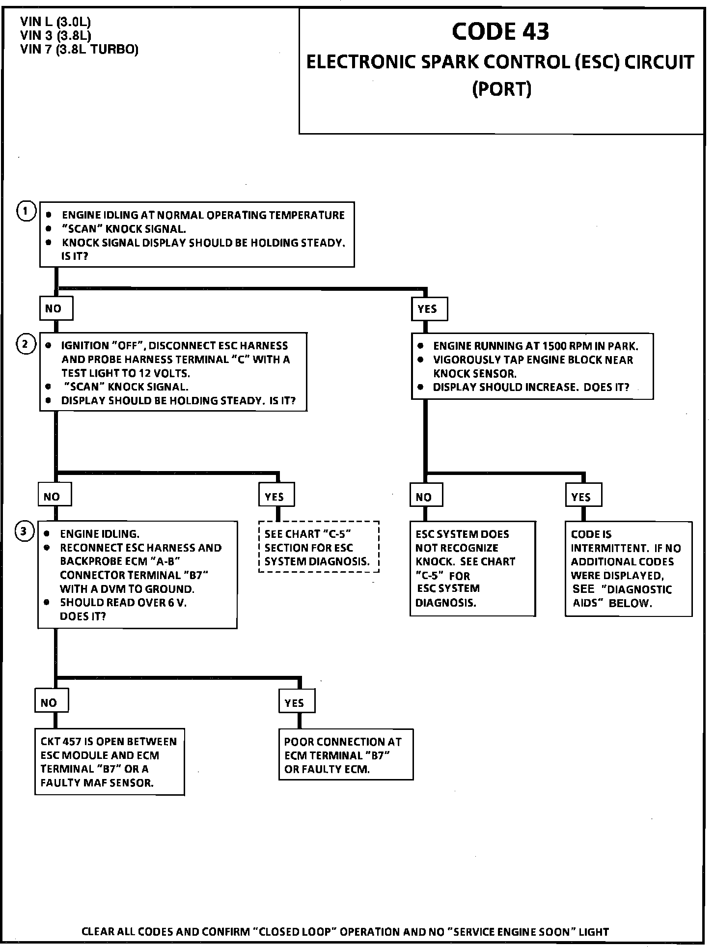 The Electronic Spark Control (ESC) system is comprised of a knock sensor and an ESC module. The ESC module sends a voltage signal (8 to 10 volts) to the Electronic Control Module (ECM). When the sensor detects detonation, the module turns "OFF" the circuit to the ECM and the voltage at ECM terminal "B7" drops to 0 volts. The ECM then retards EST as much as 20 degrees in one (1) degree increments, to reduce detonation. This happens fast and frequently enough that if looking at this signal with a DVM, you won't see 0 volts, but an average voltage somewhat less than what is normal with no detonation. A loss of the knock sensor signal or a loss of ground at the ESC module would cause the signal at the ECM to remain high. The ECM would control ignition timing (EST) as if no detonation were occuring. The EST would not be retarded, and detonation could become severe enough under heavy engine load conditions to result in pre-ignition and potential engine damage. Loss of the ESC signal to the ECM would cause the ECM to constantly retard the EST to its max retard This could result in sluggish performance and cause a Code 43 to set.
