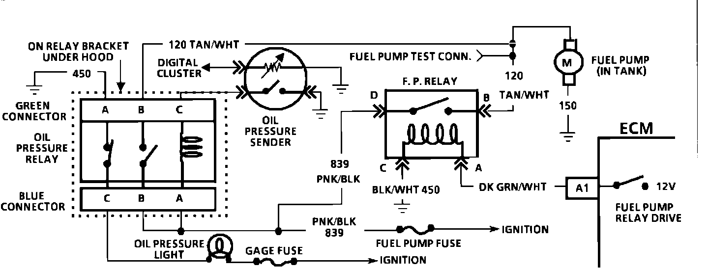 1. If the fuse is blown, a short to ground in CKTs 120, 839 or the fuel pump itself is the cause.