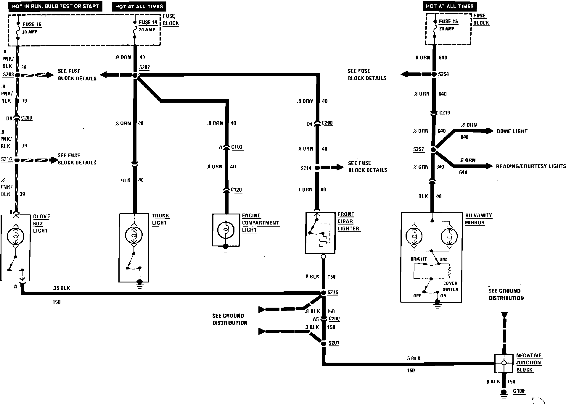 Interior Lamps & Lighters Wiring Circuit (Engine Compartment Lamp, Front Cigar Lighter, Glove Box, Rear Courtesy, Trunk & Vanity Mirror Lamps.: