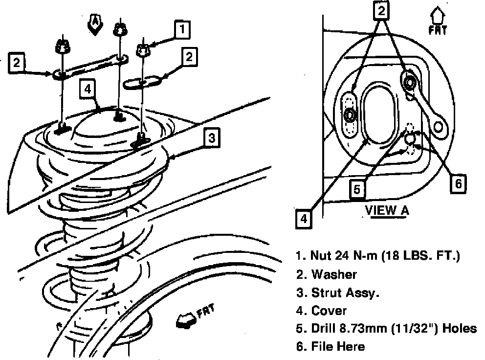 4. Drill 11/32 inch holes at front and rear of oval strut mounting hole and file excess metal, Fig. 1.