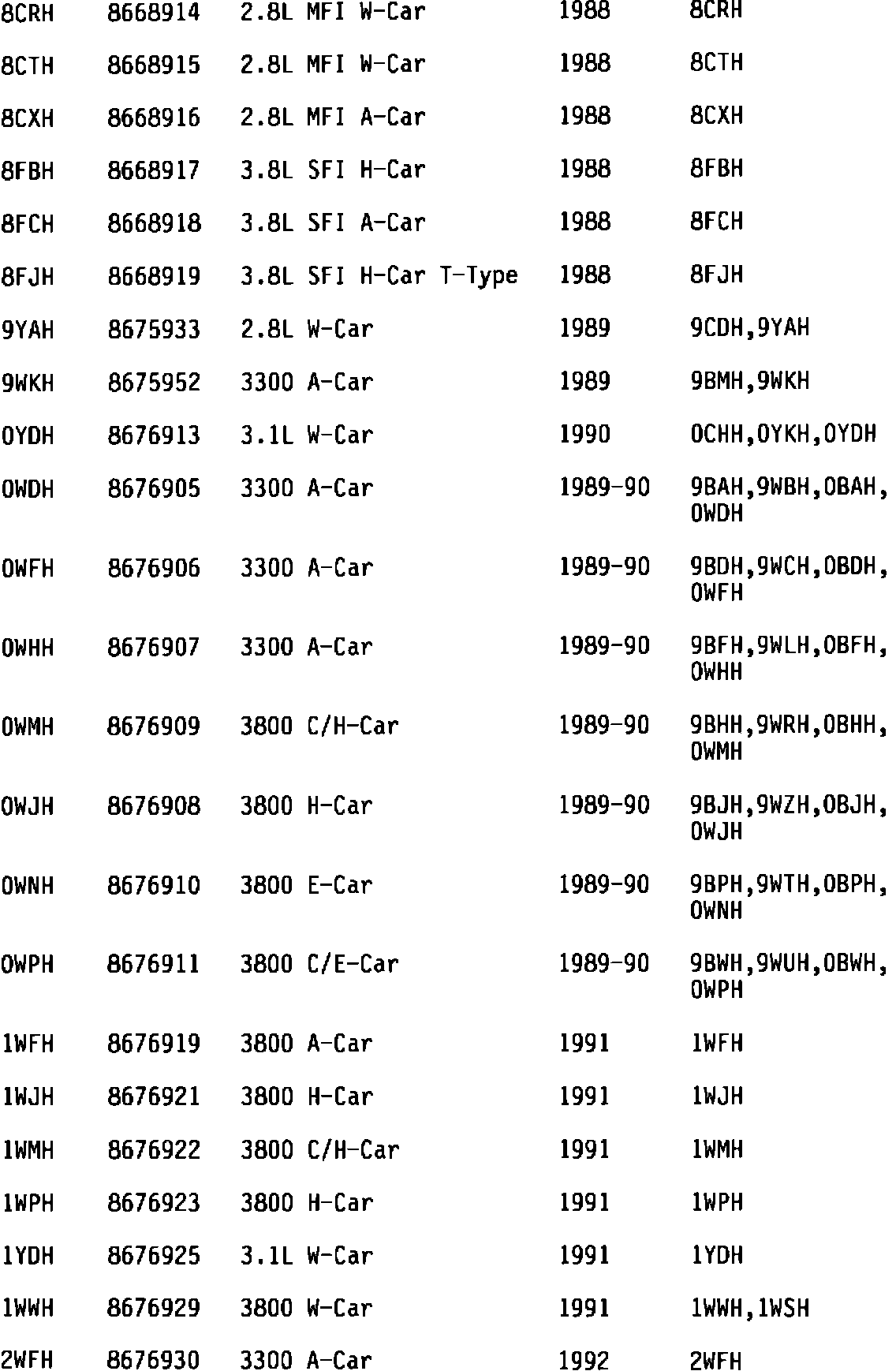 This bulletin expands the list of available SRTA part numbers and covers broad usage. The SRTA chart provides a complete list of the 1984 through 1992 models available through GMSPO. If questions arise concerning model application, consult the GMSPO catalog for the latest, most specific usage.