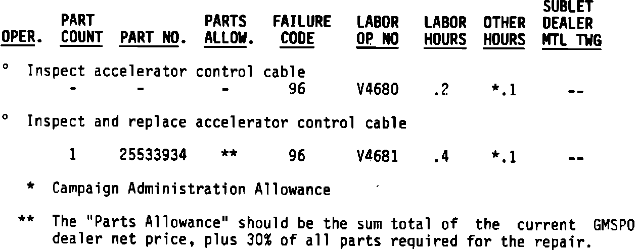 To prevent the possibility of this condition occurring, the accelerator control cable will be inspected and, if required, replaced. This service will be performed for you at no charge.