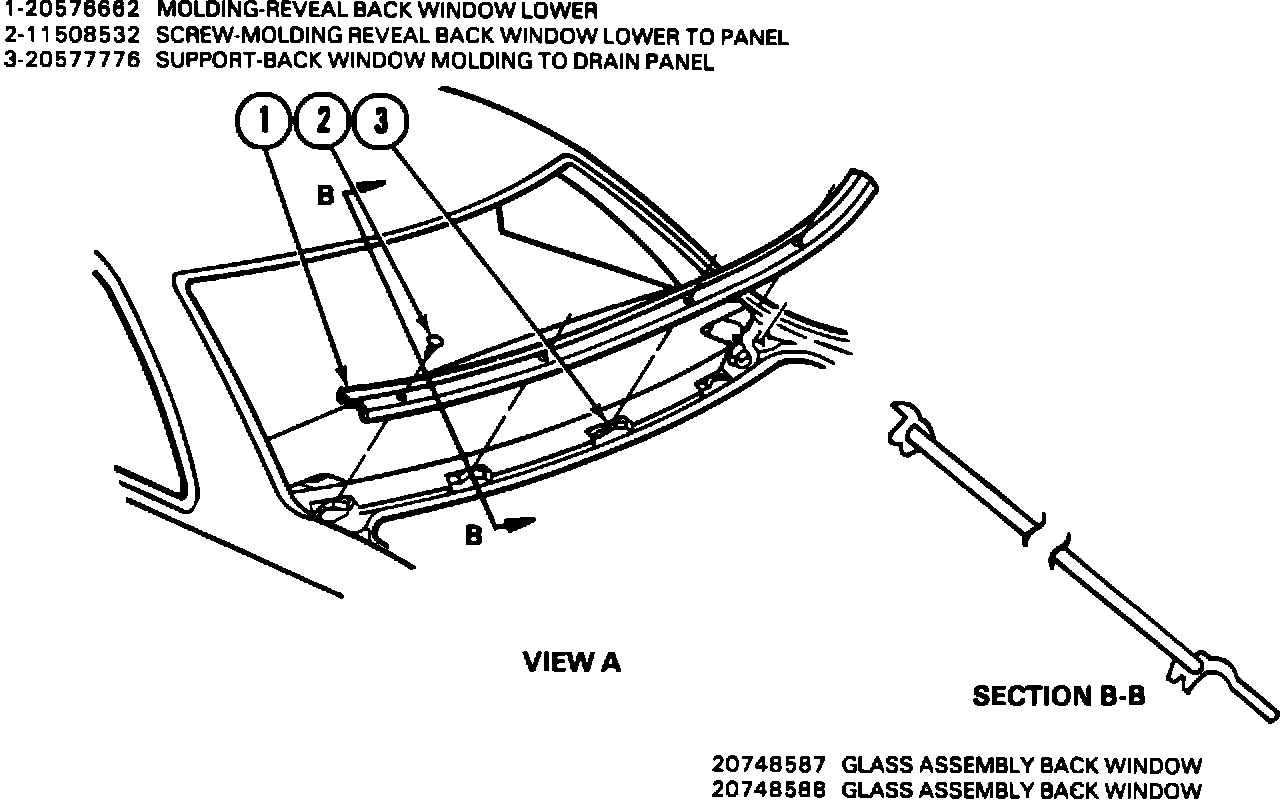 The old glass assembly, part number 20745202 or 20745204, have been deleted from service because it will not work as a replacement part for current production. The welded on mounting stools for the back window lower reveal molding have been eliminated. Replacement on LeSabre vehicles built prior to VIN 1G4HP14C6KH518140 will also use the new glass assembly (20748587 or 20748588). This can be done by removing the hat section stools used for mounting the lower reveal molding.