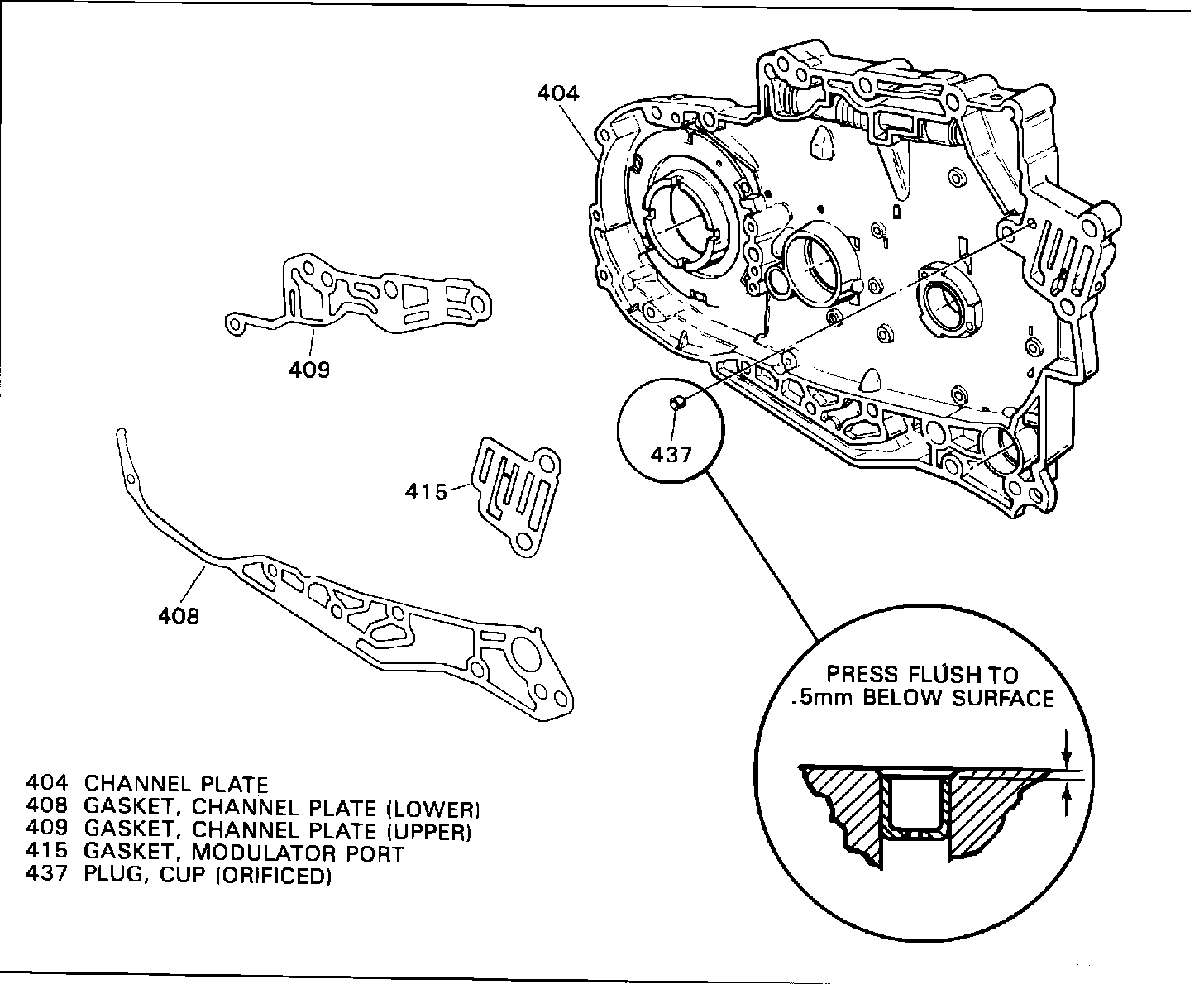 Remove the transaxle from the vehicle and remove the channel plate (404) from the transaxle. Install the orificed cup plug (437) from the service package listed in "Service Parts Information". The cup plug is properly installed at 0.0 - 0.5 mm (.020") below the channel plate machined surface and must be staked securely.