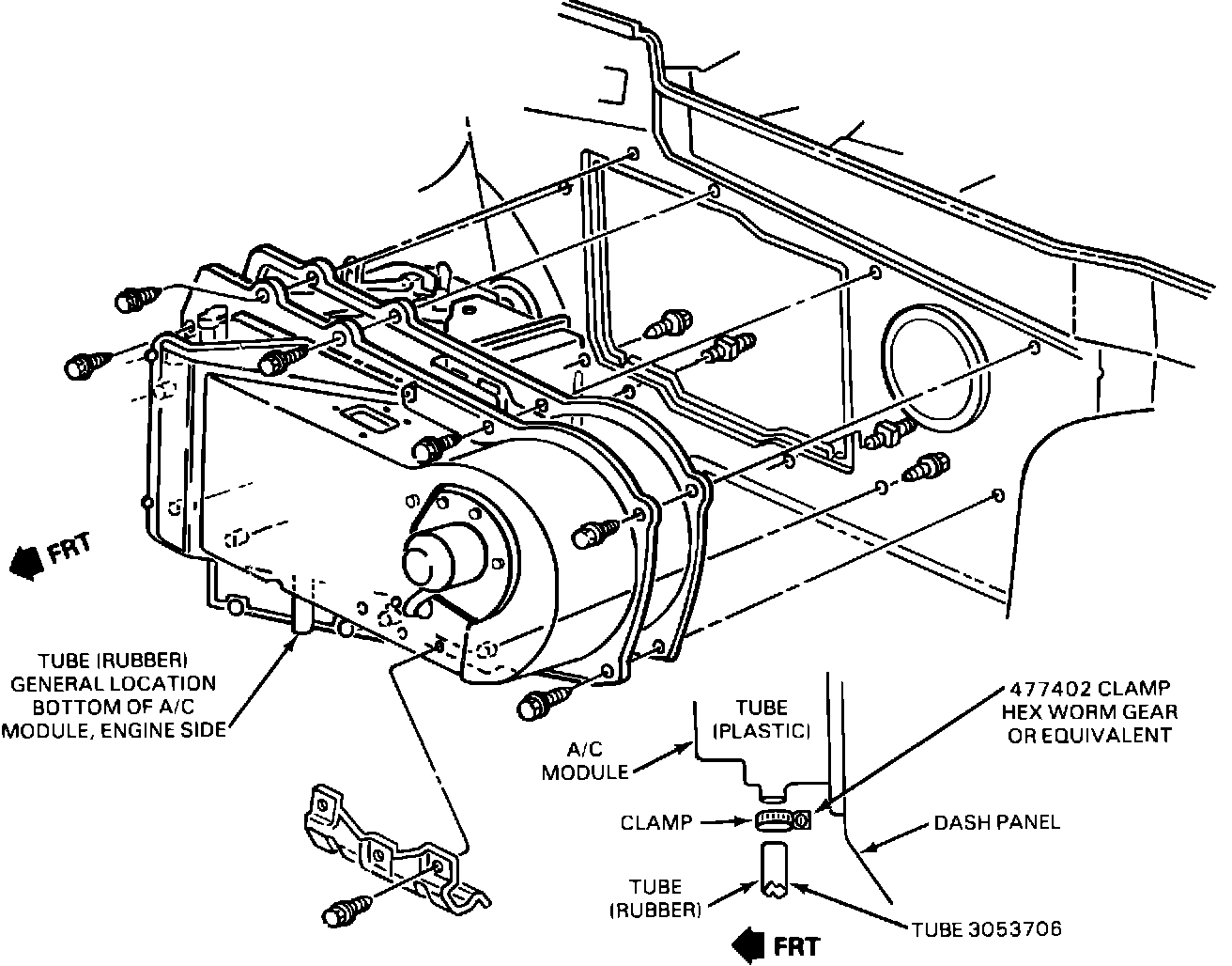 The correction is to extend the heater ventilation air condition case plastic drain with a rubber tube 1/2" I.D. x 2" long, Part Number 3053706, using clamp 477402 (or equivalent hex worm gear). This can most easily be installed with the vehicle raised on a hoist (see attached Illustration).