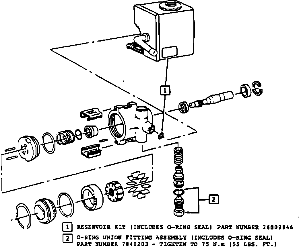 In cases where customers have comments about power steering system noise, even after bleeding the power steering system (see New Bleed procedure below), the power steering noise condition can be corrected by installing a new reservoir, Part Number 26009846, available thru GMSPO. This new reservoir has increased baffling and is approximately 6 mm taller, and will prevent fluid aeration due to sloshing.