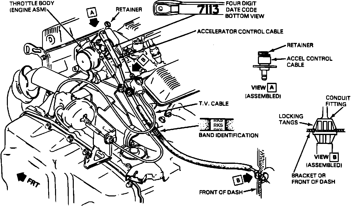 7. Depress accelerator control cable locking tangs at front of dash and remove cable (Figure 1, View B).