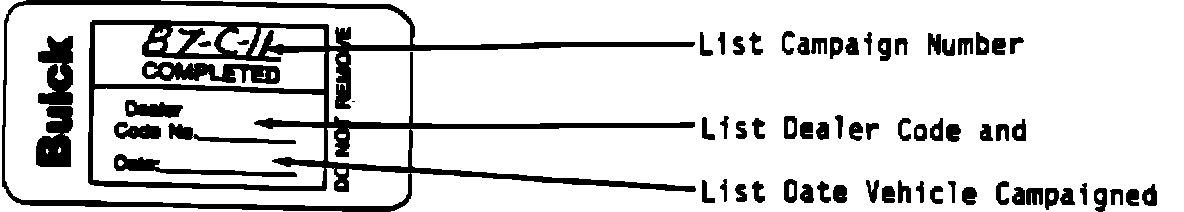 Each label provides a space to include the campaign number, the five (5) digit dealer code of the dealer performing the campaign service, and the date vehicle was campaigned. This information may be inserted with a typewriter or ballpoint pen. When installing label, clean the surface of the radiator support tie bar and apply the campaign label where it is readily visible.
