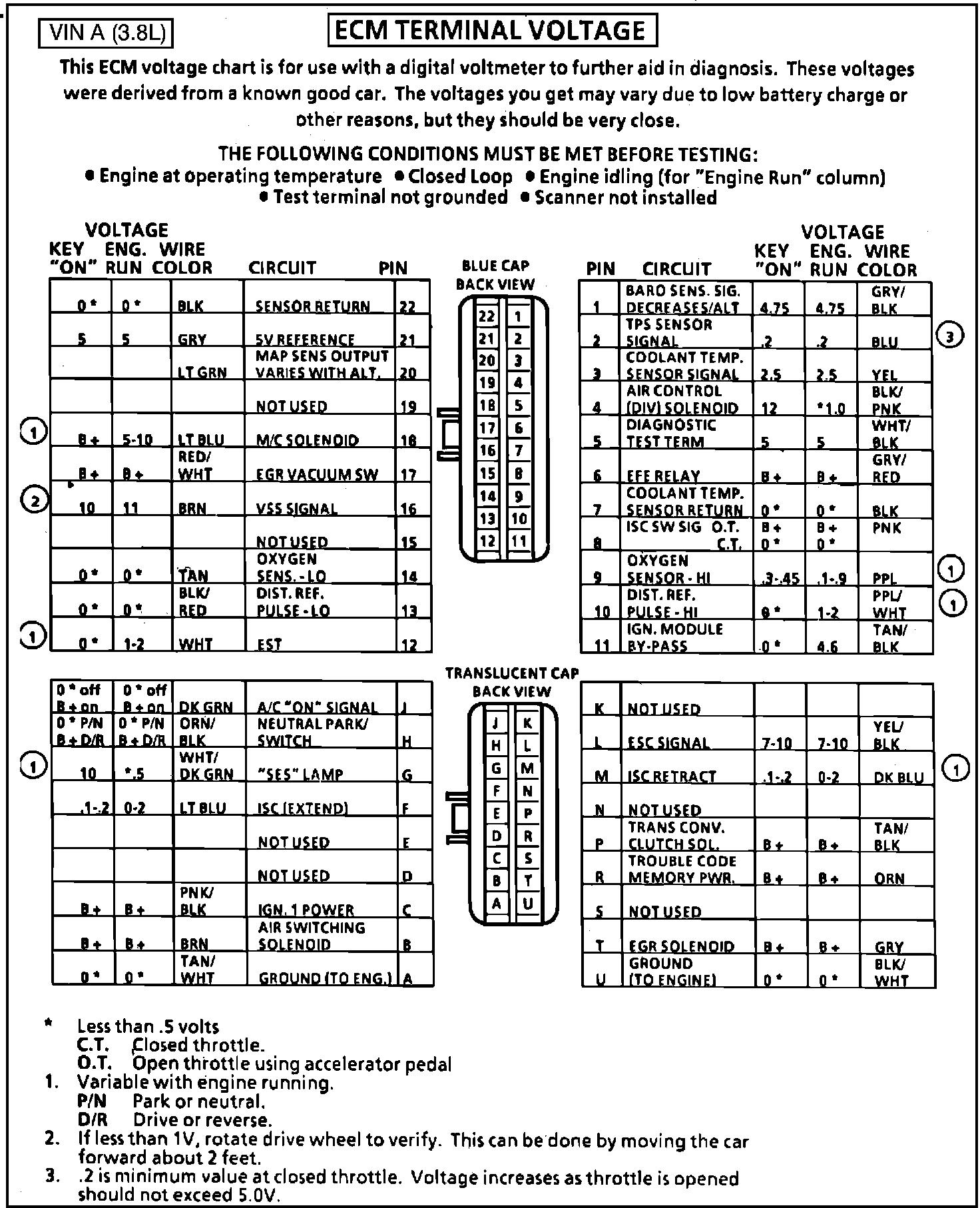Fig. 038 - ECM Connector Terminal Identification & Voltage Specifications.: