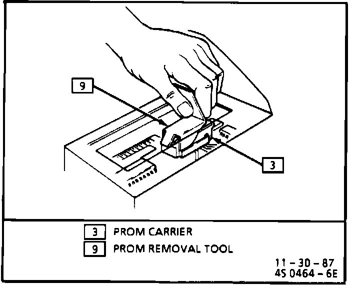 Small notch of PROM carrier should be aligned with small notch in ECM socket. Press on PROM carrier until it is firmly seated in the socket. Do not press on PROM, only on the carrier (See Figure 2).