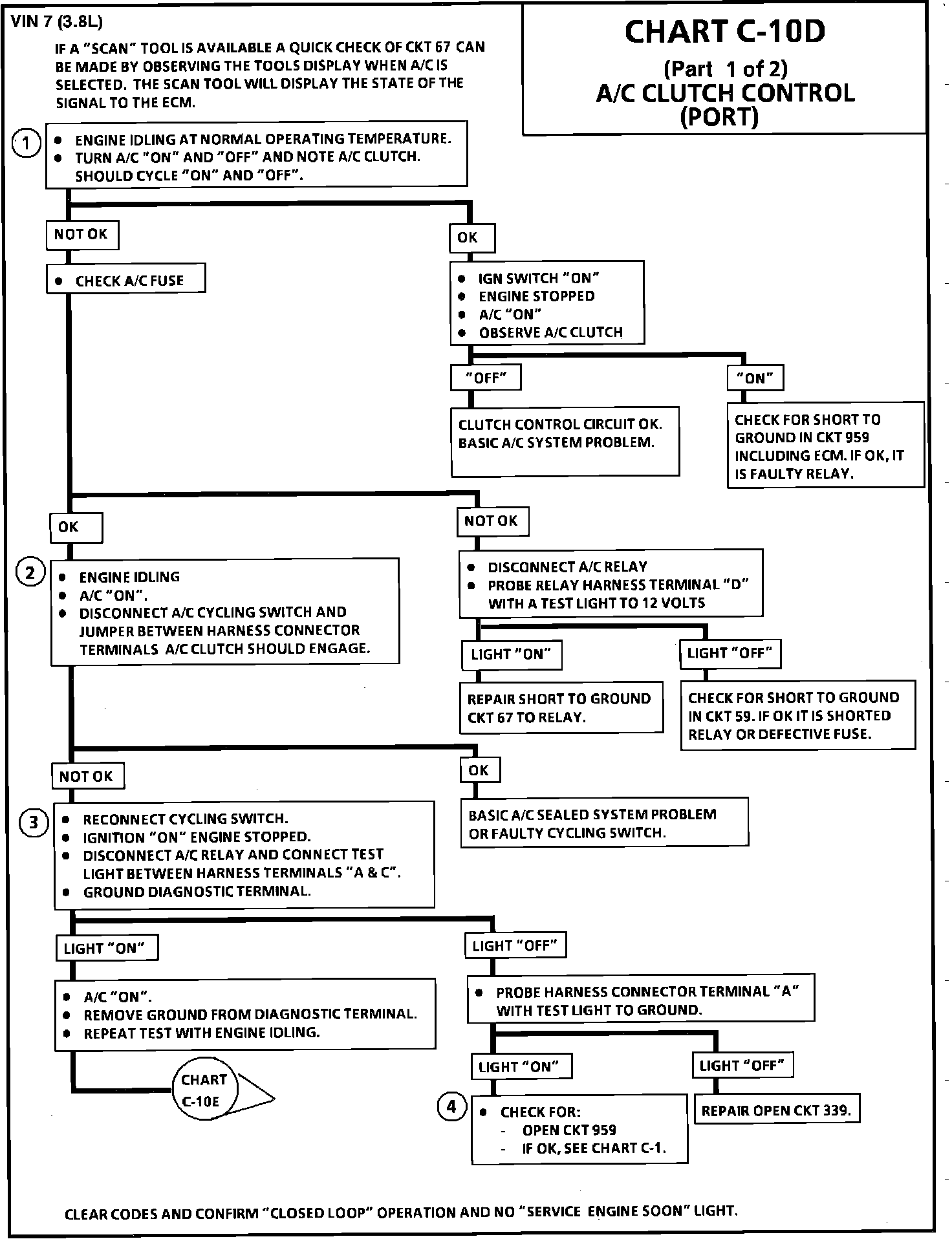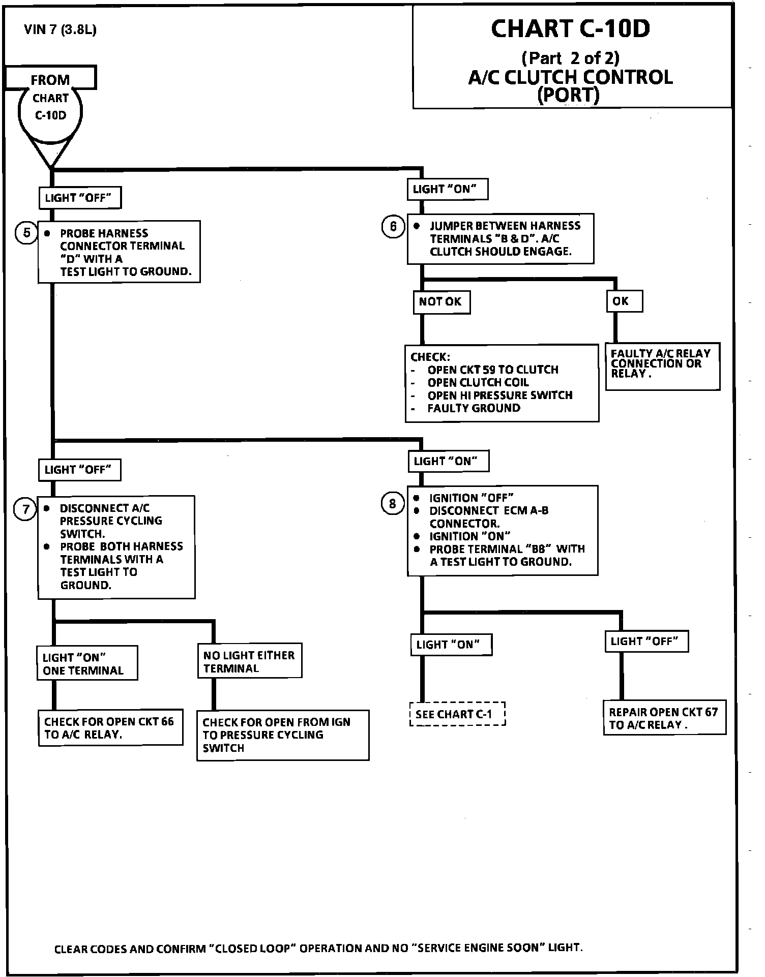8. Check to see that A/C "ON" is getting to ECM through CKT 67. A test light off at this time indicates CKT 67 is open between the cycling switch and the ECM.