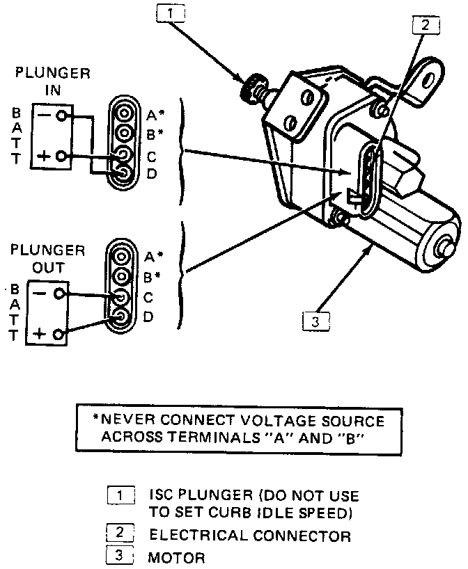 CAUTION: DO NOT leave battery voltage applied to motor longer than necessary to retract ISC plunger. Prolonged contact will damage motor. Also, NEVER connect voltage source across terminals "A" and "B" as damage to the internal throttle contact switch will result.