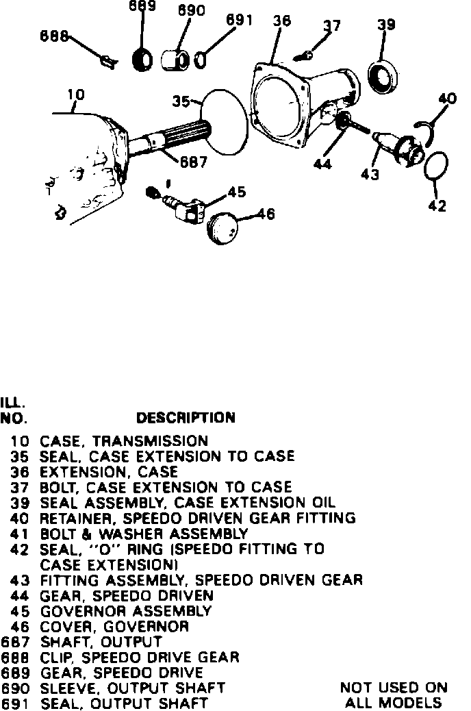 Transmission fluid leak at the plastic speedometer driven gear (44, Figure 1) can be caused by a hole in the driven gear shaft. This condition could be misdiagnosed as a speedo driven gear fitting leak (43, Figure 1).