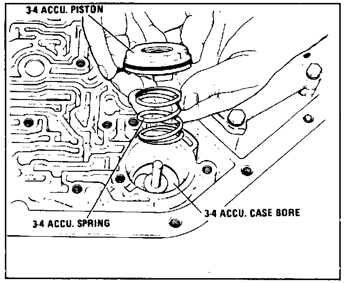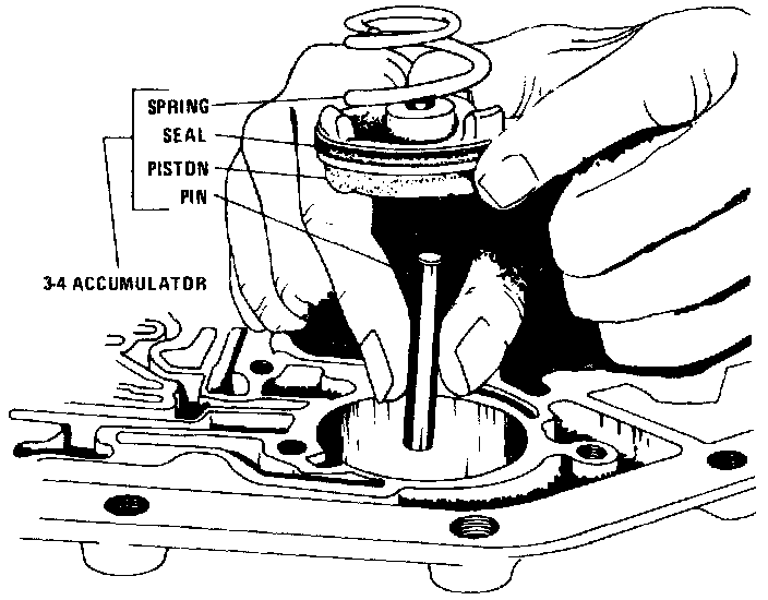 12. Remove 3-4 accumulator spring, piston and pin from transmission case.
