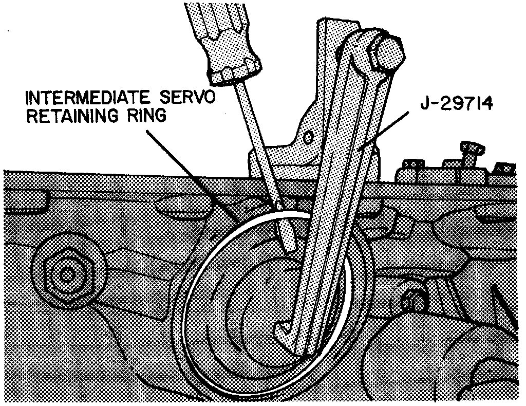 16. Using a suitable screwdriver and too No. J29714 or equivalent to secure intermediate servo cover, re move snap ring, intermediate service cover and seal ring. Intermediate servo cover seal ring may be