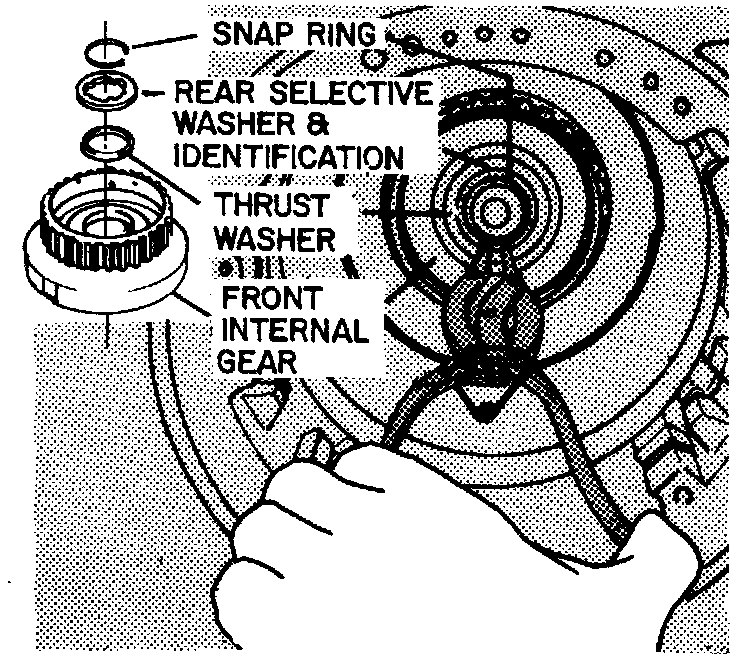 47. Remove front internal gear, rear selective thrust washer and thrust washer, from transmission case. Remove rear selective washer and thrust washer from front internal gear.