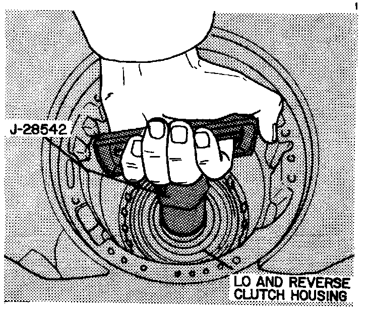 53. Using tool No. J28542, remove Lo and reverse clutch housing assembly and spacer from transmission case. Ensure governor has been removed before proceeding with step 54.