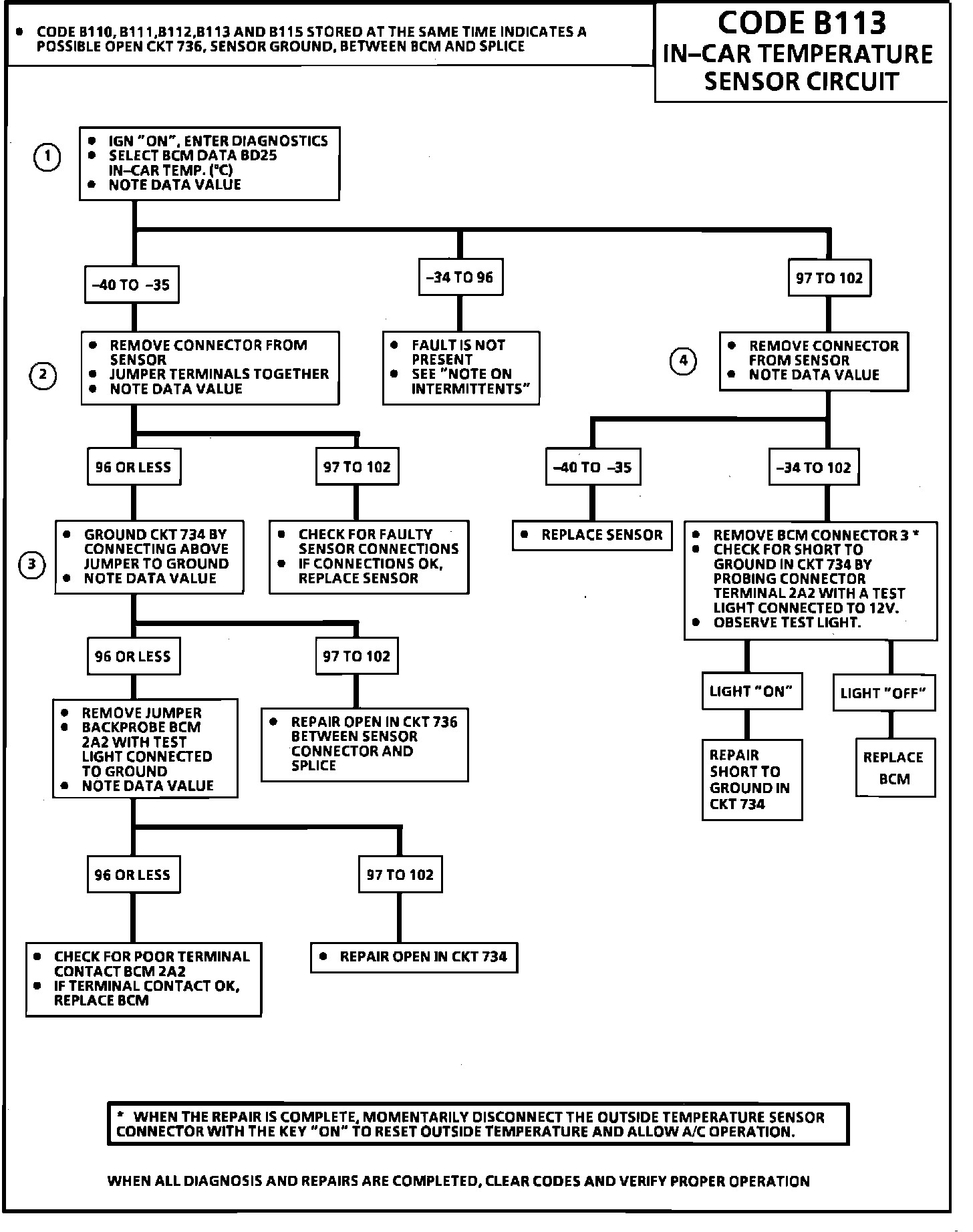 If an intermittent Code B113 is being set, manipulate the related wiring while observing BCM data BD25. If the failure is induced, the reading will jump from its normal value to a reading outside the range of -34 to 96~C. If the value displayed by BD25 is not reasonably close to the actual temperature of the air at the sensor, check for proper terminal contact or replace the sensor.