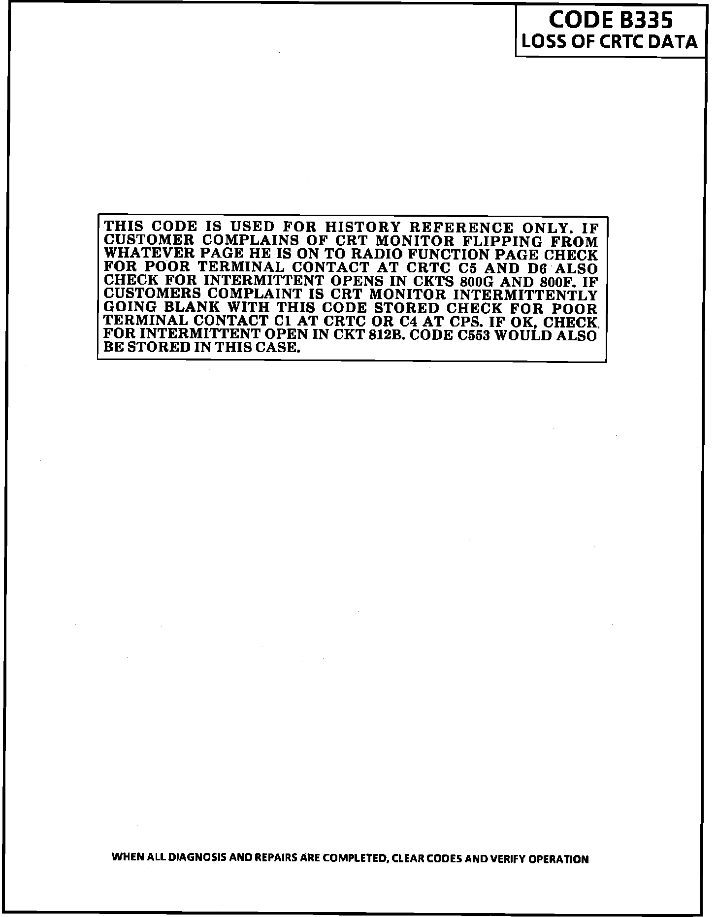 This code can only be displayed as "history", indicating an intermittent problem. The code cannot be displayed as "Current" since this would mean the problem is present now, and if the problem is present diagnostics can not be entered to read codes out. Code B335 will set if the ignition is on and the BCM is not able to exchange data with the CRTC. If the problem was presently occuring, the "Self Diagnostic System Check" would address the problem. If this code ever appears, the operator may complain that the CRT sometimes flips to a radio function page. This intermittent problem would be caused by two opens in the data circuit, one on either side of the CRTC isolating it from the BCM, or the CRTC.
