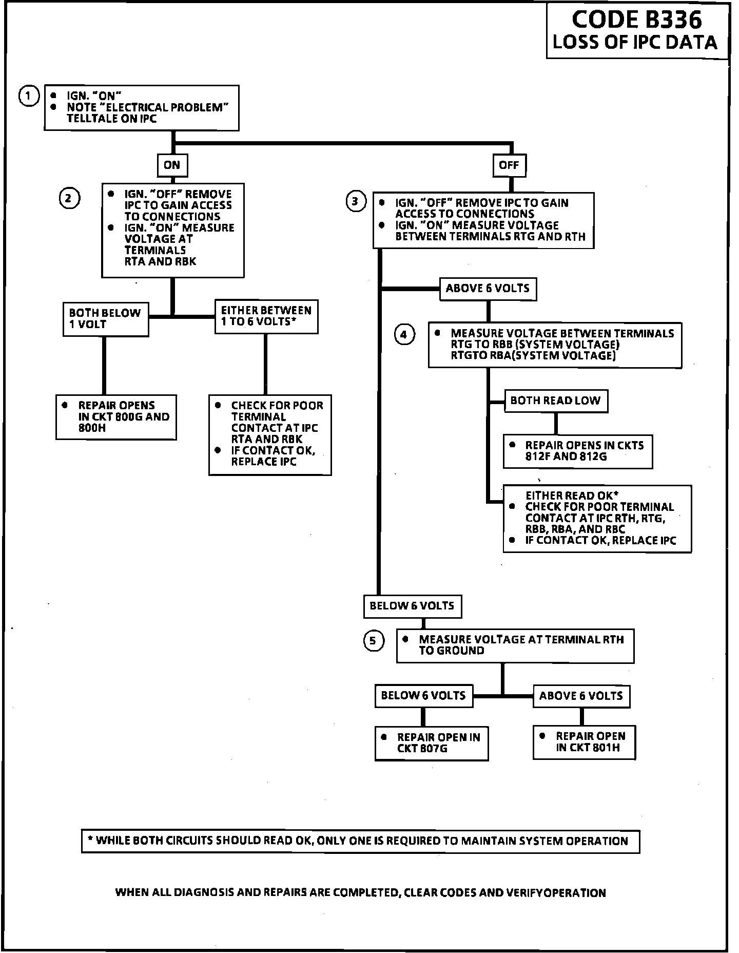 If only code B336 shows up as "History", check for momentary opens in CKT 800H and 800G, or momentary loss of both 12 volt circuit (812F and 812G), or momentary loss of 7 volt (CKT 807H), or momentary loss of ground (CKT 801H).