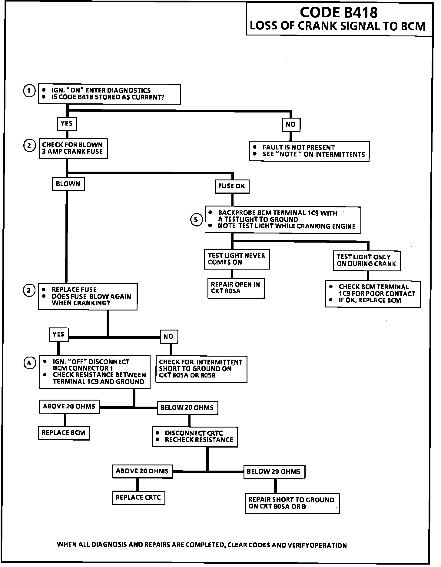 Code B418 will set when the ignition is on, engine RPM is greater than 640 and the crank signal input (CKT 805 from the 3A crank fuse) is still or never did go HI (system voltage). These conditions cannot be observed, as the purpose of the crank input is to signal the BCM to shut off when cranking so that voltage variations that are normal during crank do not affect the electronic devices. CKT 805, crank signal input, is HI (system voltage) when the ignition switch is in the crank position. If this code sets, fix this problem before trusting any other codes that may have set as erratic voltages during crank could cause false setting of codes.