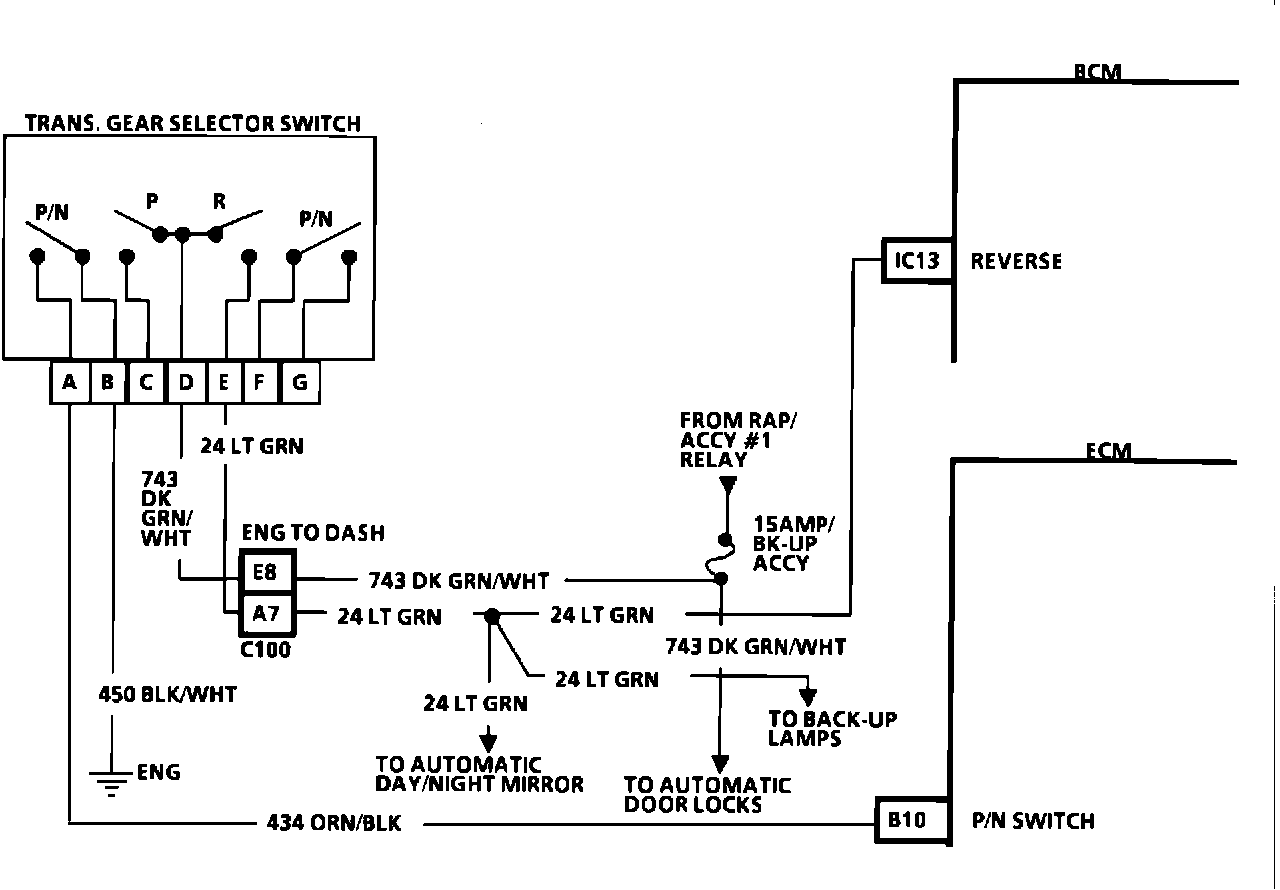 2. ECM input E174 displays P/N gear status, as HI or LO depending on the voltage state at the ECM. The display should read LO only when the transaxle is in park or neutral. If it reads LO in any other gear selection the switch must be misadjusted, or CKT 434 (including the switch) is shorted to ground.