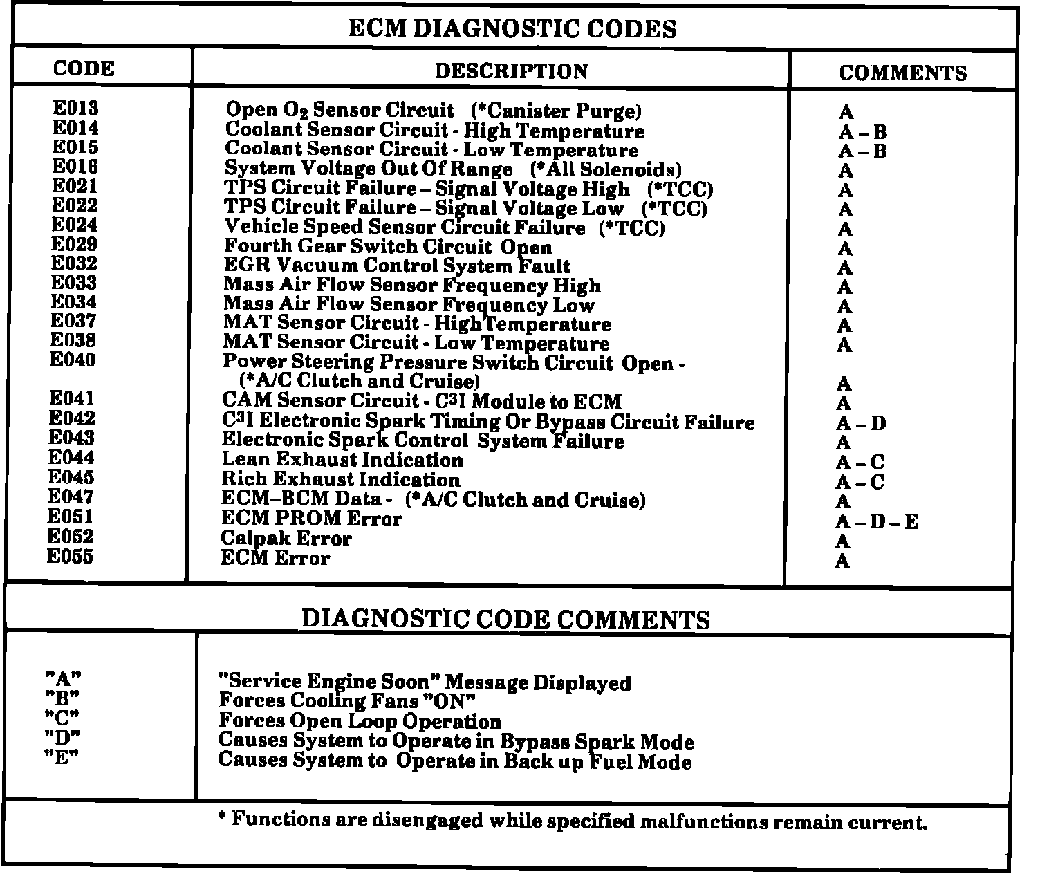 When the ECM diagnostics are activated, the display will show all codes stored in the ECM and BCM. (See Diagnostic Codes Chart or the code list and the comments relative to each code.) The code comments can be a great aid in helping to diagnose an emission or driveability problem.