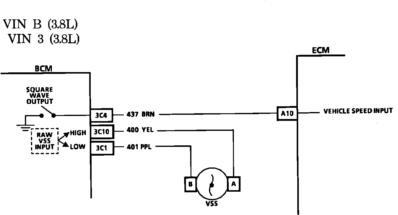 The VSS system incorporates three major components; the vehicle speed generator, the BCM, and the ECM. The vehicle speed sensor is a permanent magnet generator assembly attached to the transaxle. As the vehicle moves, the generator creates a "sine wave" electrical pulse which is monitored by the BCM. In the BCM, this is amplified and "cleaned up" via the same process used in a buffer. Part of this "cleaning up" involves changing the "sine wave" signal to "a square wave" or on/off type signal. By determining the length of time between the "ON" and "OFF" portions of this signal, the BCM can interpret the vehicle speed. It then transmits this data via CKT 437 to the ECM.
