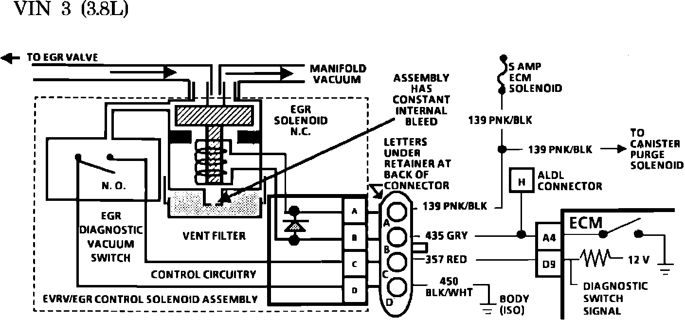 The normally open EGR Diagnostic Vacuum Switch monitors the vacuum to the EGR Valve and signals the ECM when control vacuum is applied to the valve (switch closes). The ECM will not energize the solenoid in "Park", "Neutral", or at idle.