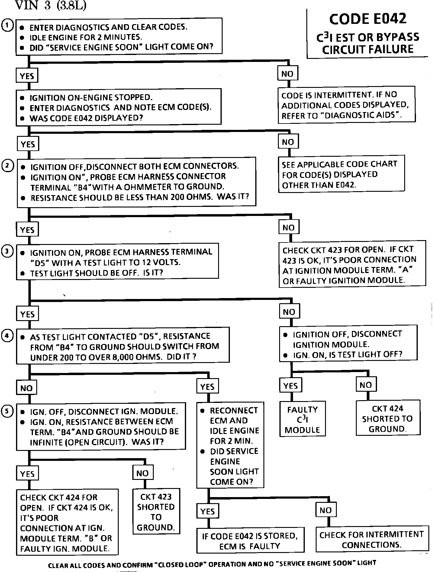 The C3-I module sends a reference signal to the ECM when the engine is cranking. While the engine is under 400 RPM, the C3-I module controls the ignition timing. When the engine speed exceeds 400 RPM, the ECM sends a 5 volt signal on the By-pass circuit (424) to switch the timing to ECM control, through the EST circuit (423). An open or ground in the EST circuit will stall the engine and set a Code E042. The engine can be re-started but will run on module timing.