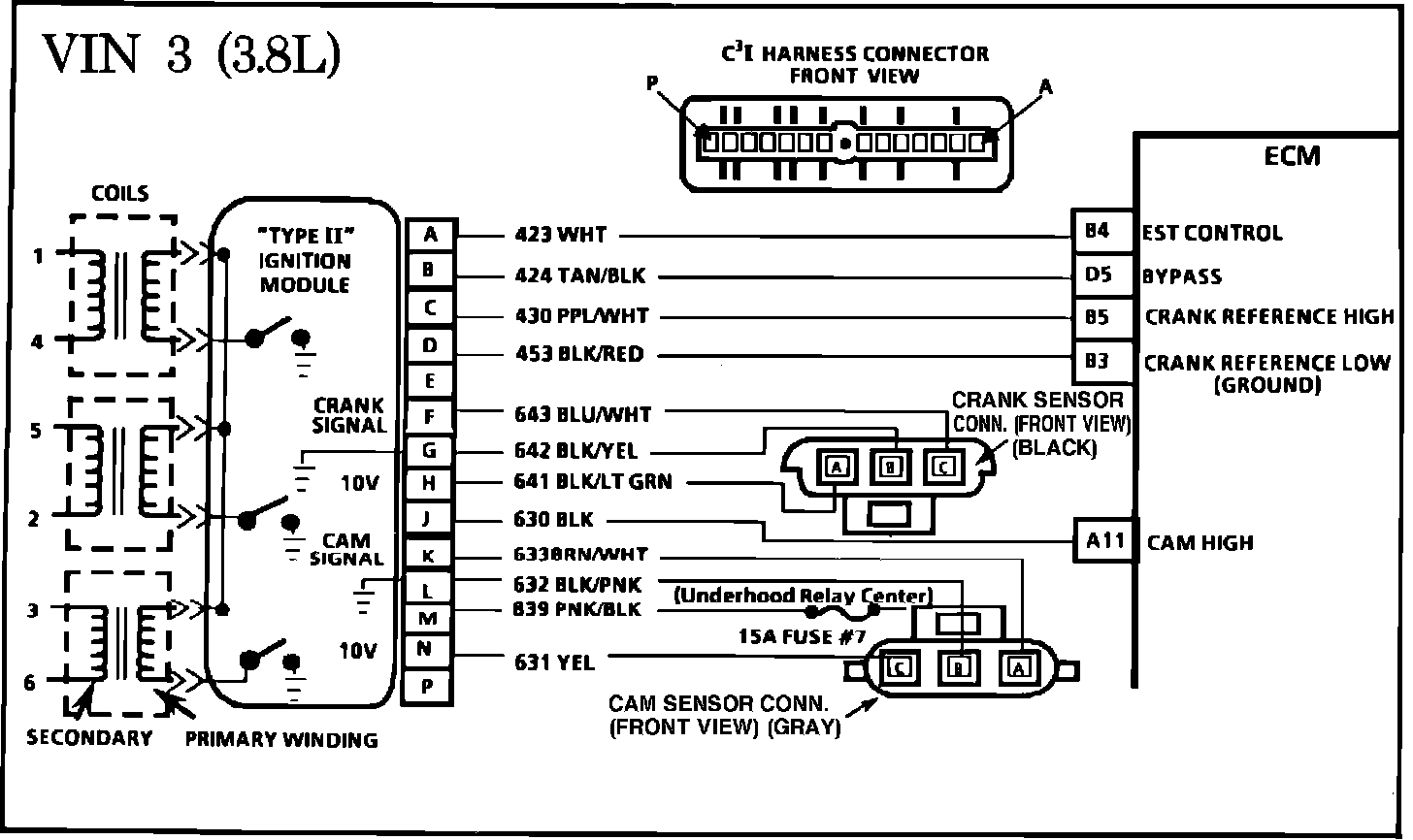 2. With the ECM disconnected, the ohmmeter should be reading less than 200 ohms, which is the normal resistance of the EST circuit through the C3I module. A higher resistance would indicate a fault in CKT 423, a poor C3-I module connection, or a faulty C3-I module.