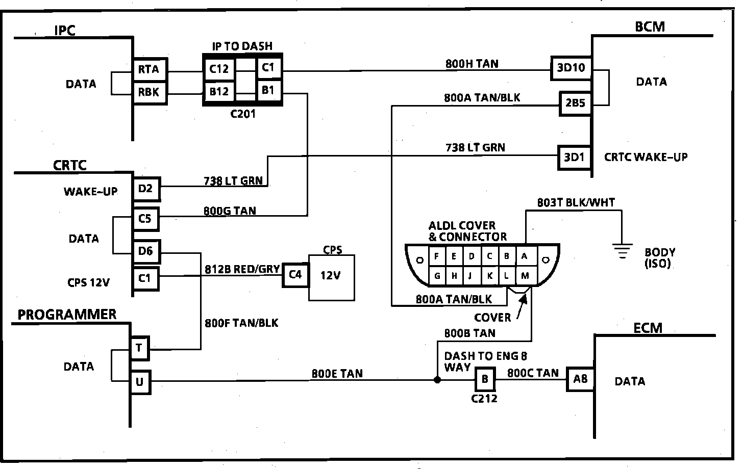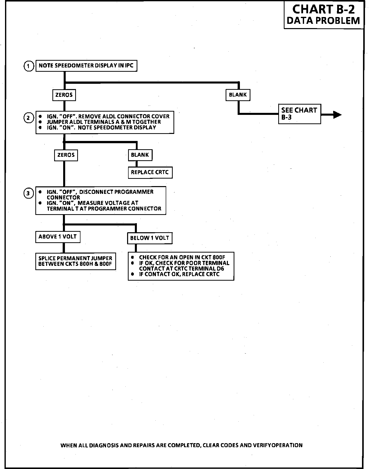 2. If the ALDL cover is off, reinstall the cover and go back to Chart B-1. Because the IPC and BCM can exchange data, the data line cannot be shorted. Since the IPC speedometer displays zero the reason the "Electrical Problem" telltale is on is because the CRTC, not the IPC, has lost data. In order for this to occur, CKT 800H must be OK and there must be two opens in the data line, one on either side of the CRTC or the CRTC is at fault. To verify the integrity of the data line, remove the ALDL cover and jumper the data line to ground. If the data line is OK, the speedometer will go blank as jumpering the data line to ground will stop all communication.