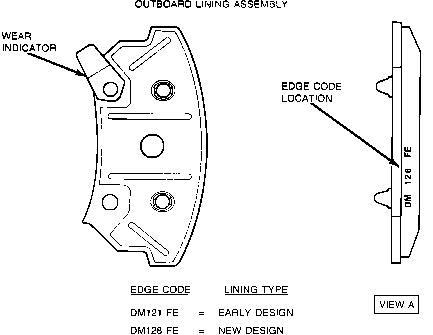The lining edge code, which is stamped in the lining material at the locations shown in Figure 1, may be used to identify the new shoe and lining assemblies. The new design shoe and lining assemblies use the edge code "DM 128 FE", while early production linings include the edge code "DM 121 FE".