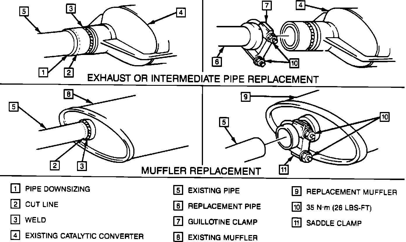8. Reverse the above steps to install the new intermediate pipe and muffler assembly. Use a saddle type clamp at the pipe to muffler joint. Use a guillotine type clamp at the pipe to catalytic converter joint. The following torque specifications apply: