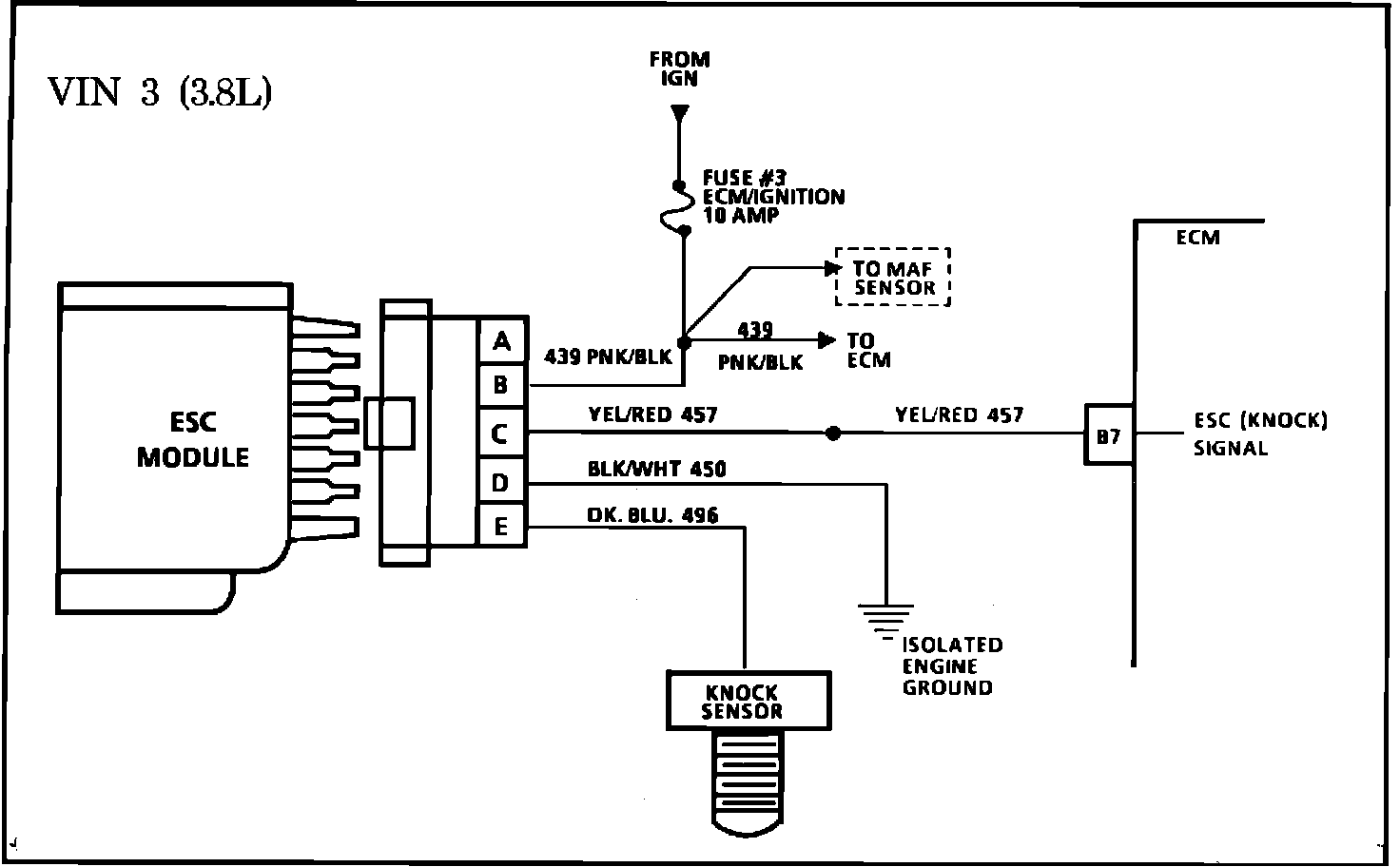 2. By disconnecting the ESC module, the ECM monitors a low voltage at terminal "B7" and should retard the ignition timing.