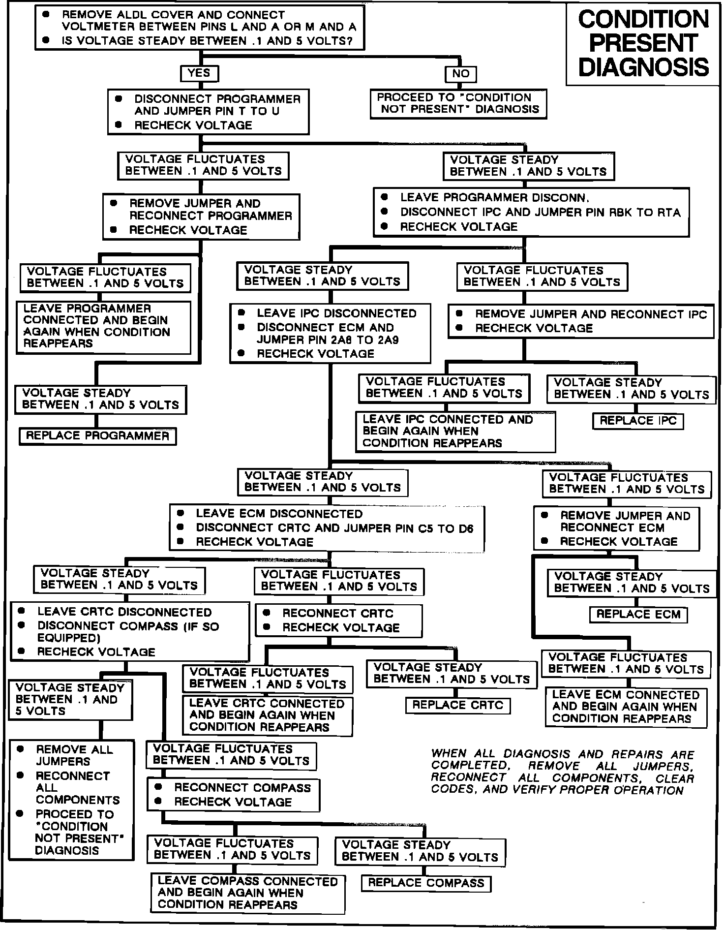 If one of the components on the serial dataline is affecting the dataline voltage, the serial data voltage at the ALDL connector will be a steady value anywhere between .1 and 5 volts (e.g. , 2.7V, 3.5V, etc.). To determine which of the components is causing the condition, it is necessary to try and isolate the component using the following CONDITION PRESENT DIAGNOSIS chart.